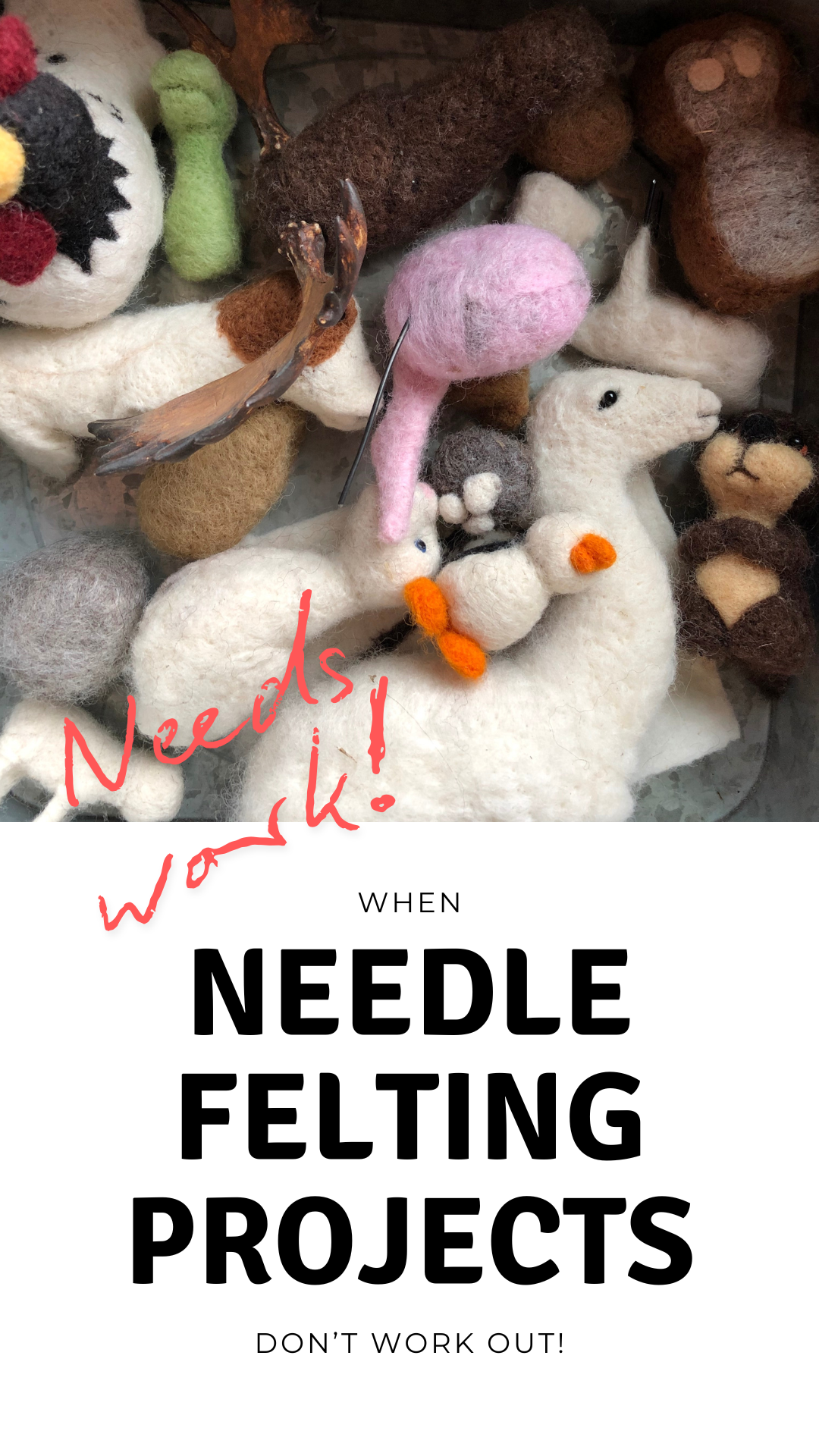 Needle felting is a journey, not a test. Some days the wool cooperates and magic happens. Other days… well, you end up with a very large, oddly colored cat and a few new pieces for the Frankenstein bucket.
